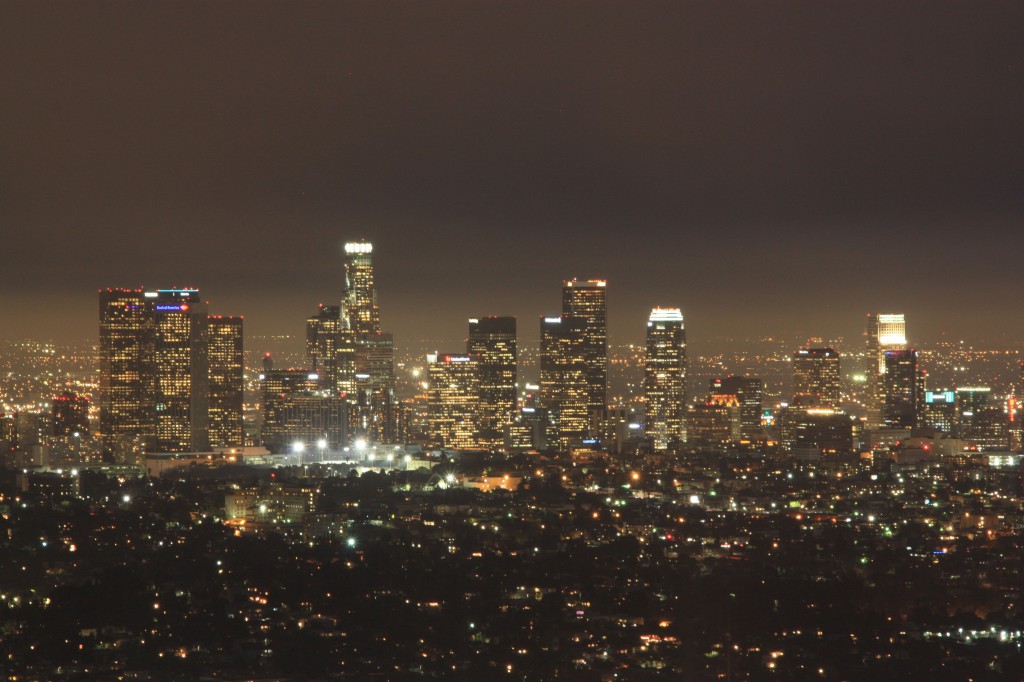 Nun wurde es aber Zeit für den Sunset im Griffith-Park beim Observatorium. Die Sonne lugte zwischen den Wolken hervor und das Licht war perfekt. Leider hatten wir etwas mit dem Verkehr zu kämpfen (so etwas wie „grüne Welle“ scheint es in LA nicht zu geben), sodass wir den Sonnenuntergang knapp verpassten. Nur die letzten Strahlen konnten wir noch einfangen (auf Kosten eines Fotos, von einem Kojoten der die Straße kreuzte – wir hatten ja keine Zeit). Nach dem Sonnenuntergang brach die Dämmerung herein und nach und nach tauchte die Stadt in ein glänzendes und nahezu unendlichem Lichtermeer ein! Das war richtig schön!