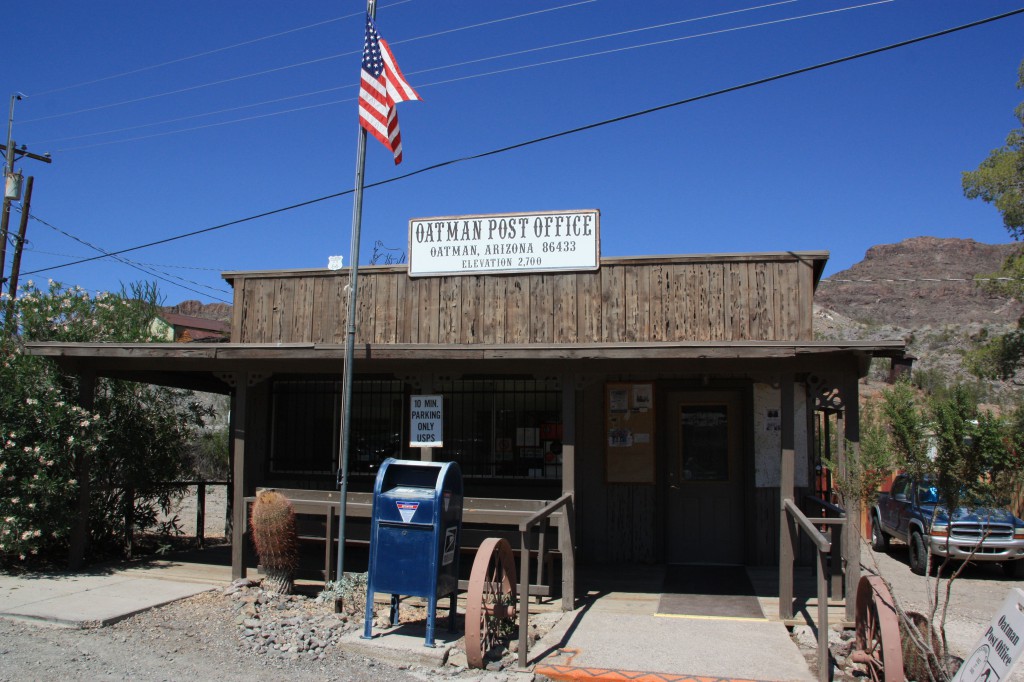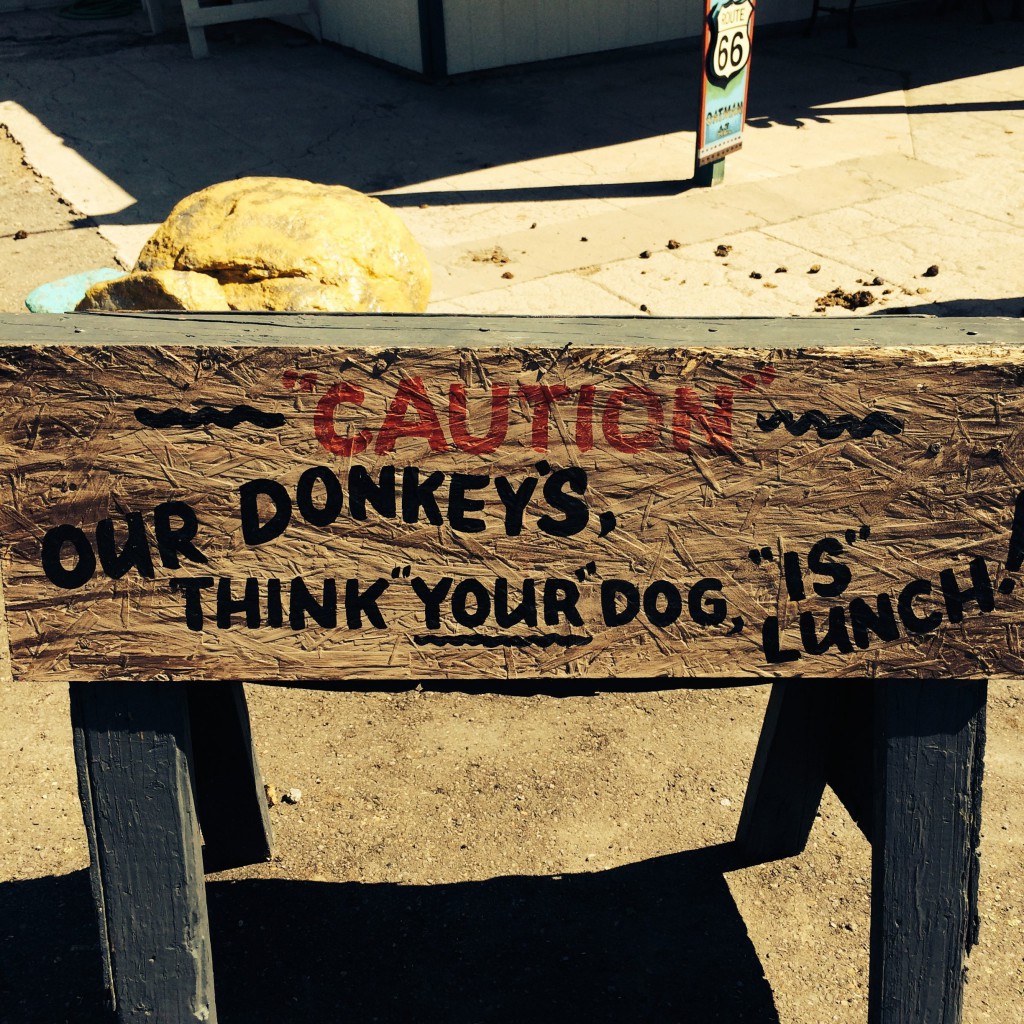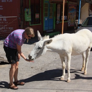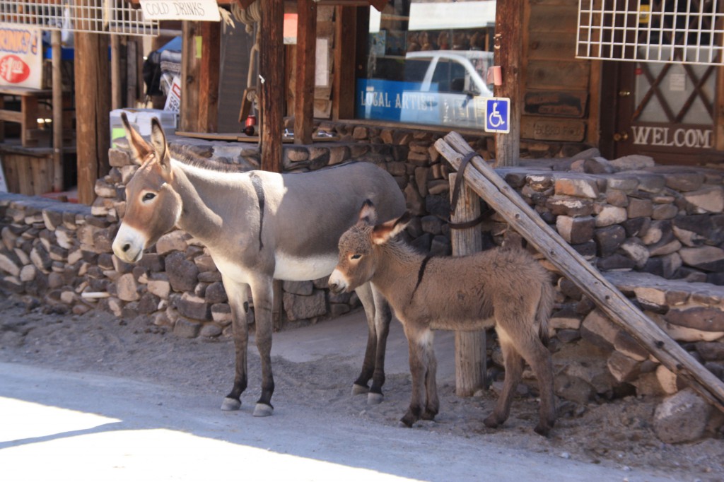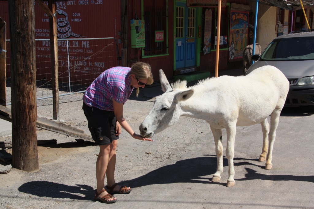 Nach einer Weile kamen wir dann in Oatman an. Als wir unser Auto gerade abgestellt hatten, parkte neben uns ein Pickup und es stieg ein älterer Mann mit Cowboy-Hut aus, der sich dann erstmal gemütlich seinen Revolvergurt umschnallte. Wie sich herausstellte, war das der Sheriff. Also bloss keinen Ärger machen… Wären hier nicht die ganzen Autos, würde man denken, man hätte eine Zeitreise gemacht. Esel liefen über die Strassen und freuten sich über Leckerlies und Männer mit Colts liefen in der Gegend rum. Die meisten Einwohner scheinen ihr Geld hier mit dem Verkauf von Andenken und Souvenirs zu verdienen (ähnlich wie in Seligman jedoch war es hier nicht so touriüberfüllt). Der Umweg hatte sich definitiv gelohnt.