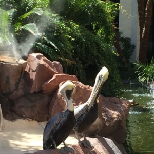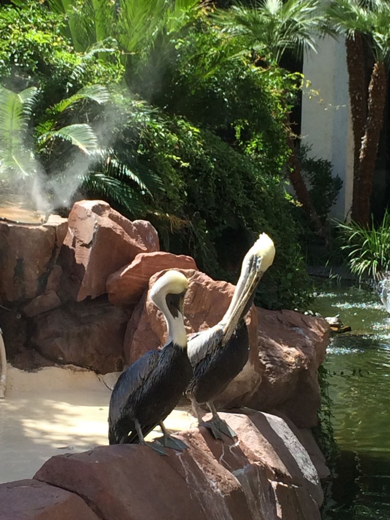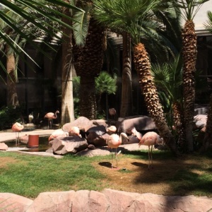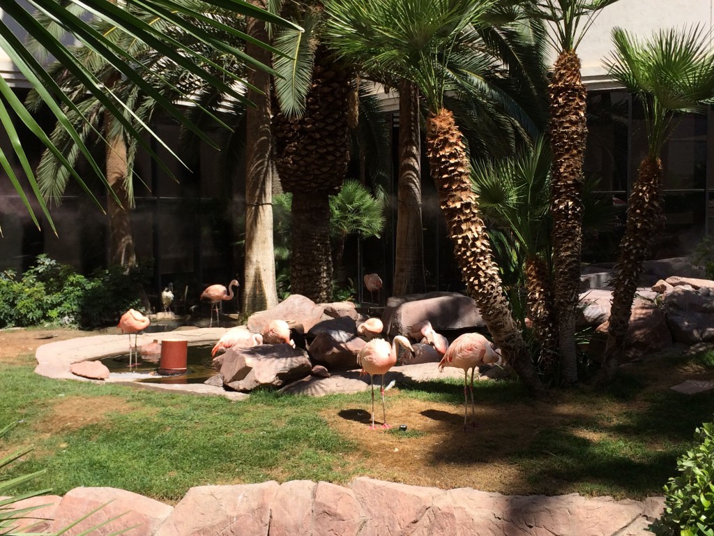Nachdem wir für unsere Verhältnisse heute mal so richtig ausgeschlafen hatten (Rike bis 8 Uhr, ich bis um 9), mussten wir erst einmal checken, wo wir denn nun frühstücken gehen. Die Auswahl fiel uns gar nicht so leicht… es gab einfach zu viele Möglichkeiten. Letztendlich entschieden wir uns für das Frühstücksbuffet im Hotel Flamingo (19$ pro Person, inkl. Kaffee, Tee und O-Saft). Die Schwierigkeit bestand nur darin, den Eingang des Restaurants (in der Unübersichtlichkeit von Hotelkomplexen) zu finden. Eingänge zum Casino fanden wir zu genüge, jedoch das Restaurant?! Fragen brachte uns schließlich ans Ziel. Das Buffet war gut. Vor allem die Dessertstation hatte reichlich Auswahl zu bieten. Da wir keinen Fensterplatz hatten, haben wir uns nach dem Frühstück den Garten mit den unterschiedlichsten Tieren angesehen (Enten, Schildkröten, Koi-Karpfen, Pelikane und natürlich Flamingos).